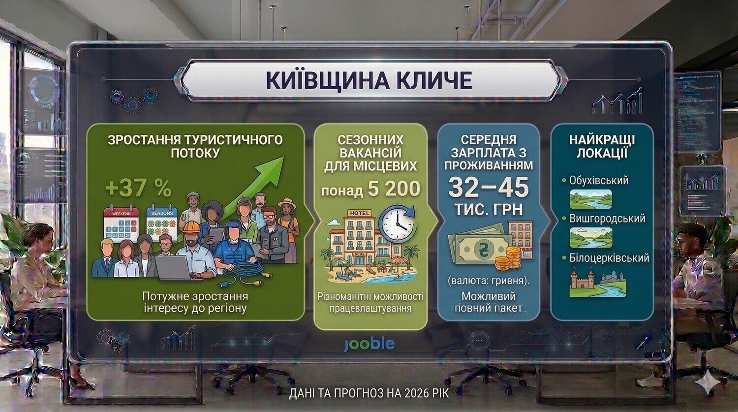 Київщина шепоче вітром у листі дубів, співає Дніпром і розкриває старовинні таємниці в кожному замку. У 2026 році вона кличе не тільки гостей — вона кличе тих, хто хоче жити серед цієї краси, дихати нею щодня й заробляти на тому, що любить. Сезонний туризм розквітає, бази відпочинку, агро-садиби та екскурсійні маршрути чекають місцевих людей. Багато жителів області вже не шукають роботу в столиці — вони просто заходять на Jooble, в розділ робота Київ і за лічені хвилини знаходять вакансії, які дозволяють знайти роботу чи вибрати вакансію серед рідних пейзажів.