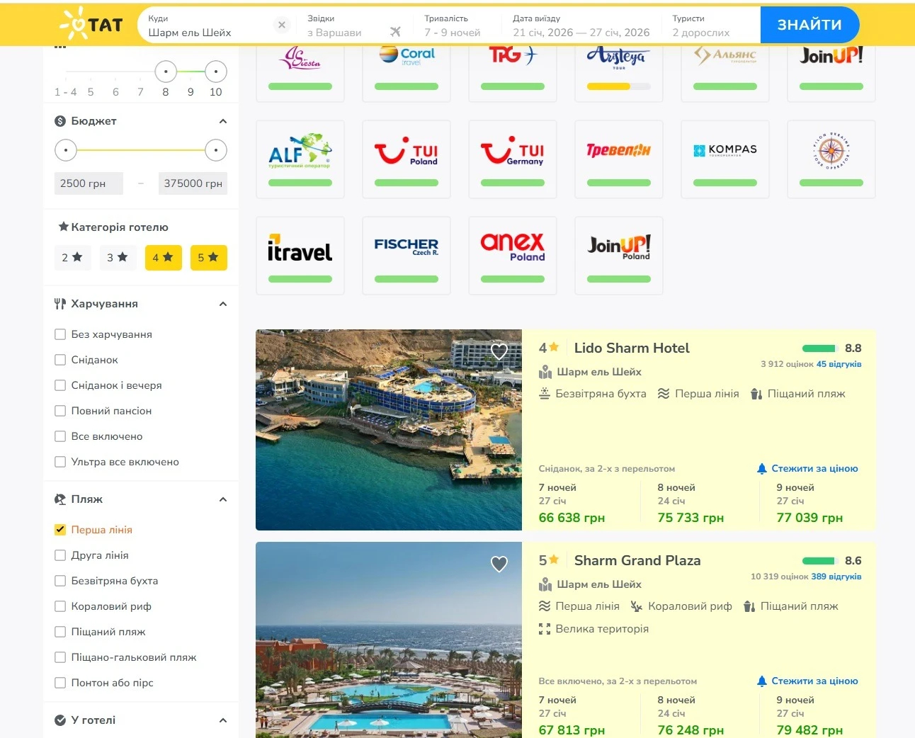 Так виглядає екран пошуку турів в Шарм-ель-Шейх з Варшави, готелі з рейтингом вище 8, 7-9 ночей, тільки 4* та 5*, перша лінія, на двох дорослих.