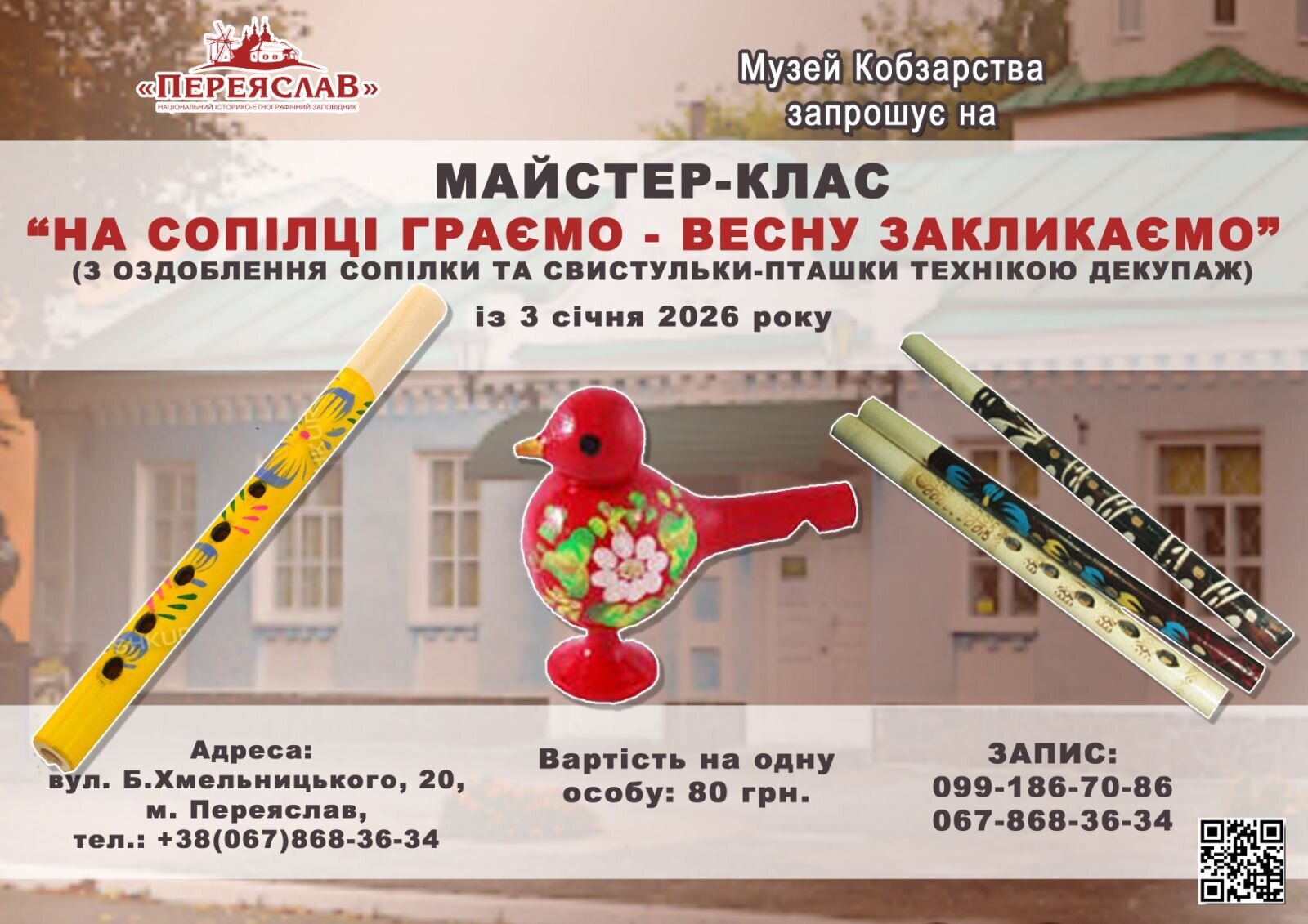 з 3 січня 2026 року м. Переяслав, вул. Б. Хмельницького, 20 Вартість: 80 грн з особи Запис обовʼязковий: 099-186-70-86 067-868-36-34