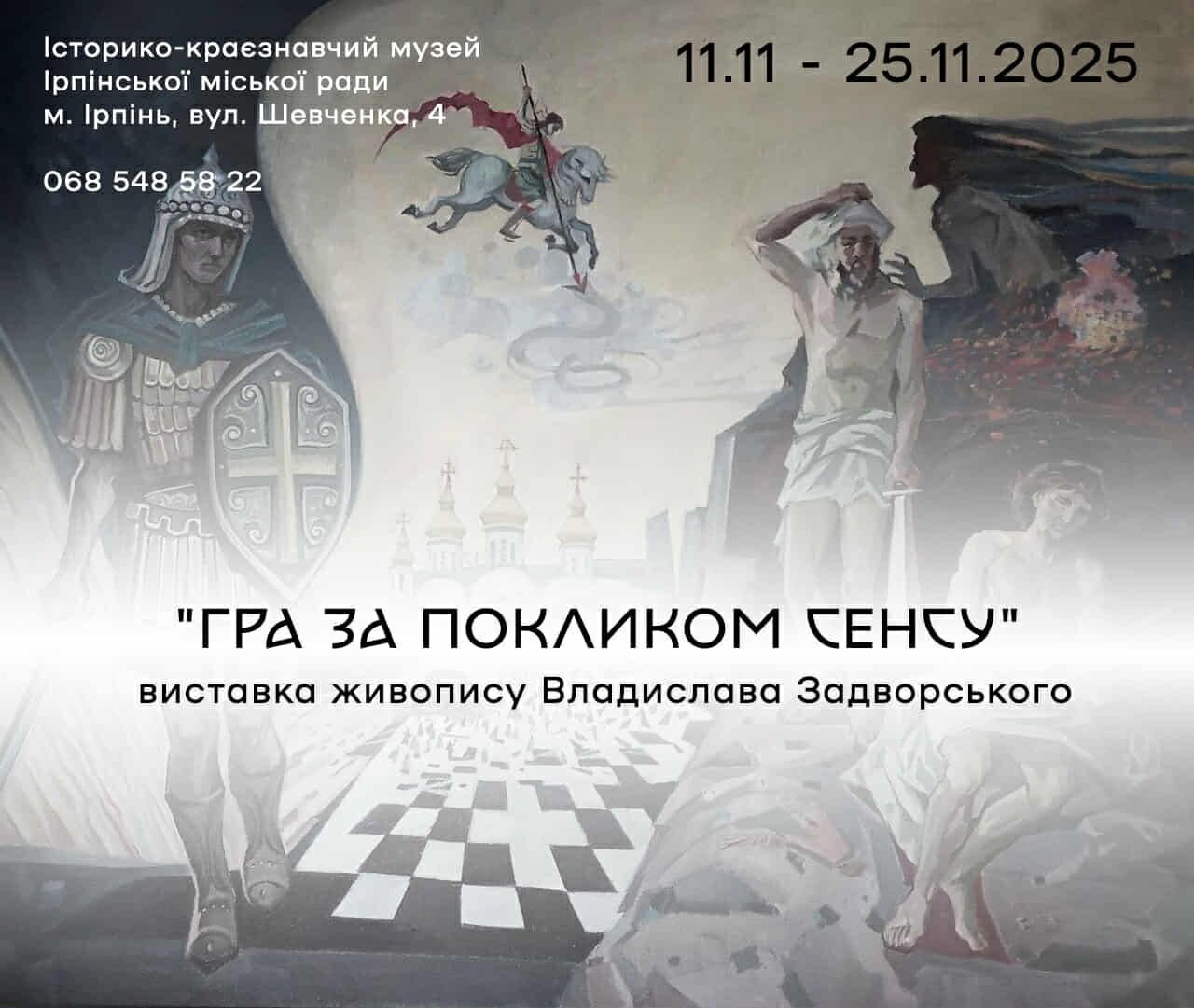 Чекаємо на вас в Історико-краєзнавчий музей Ірпінської міської ради на виставці живопису переможця художнього пленеру "Намальований Ірпінь" 2025 Владислава Задворського  "Гра за покликом сенсу"