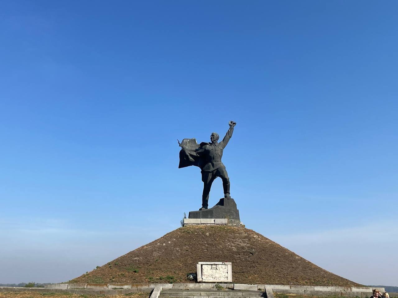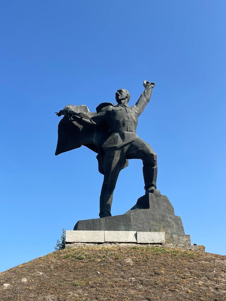 Пам’ятник встановлено на кургані, під яким знаходиться братська могила воїнів. Скульптура зображає солдата з гвинтівкою, який у рішучому пориві піднімається в атаку. У 2013 році на меморіалі відбулося урочисте перепоховання 24 воїнів, загиблих у вересні 1941 року; двох із них вдалося ідентифікувати за особистими речами.